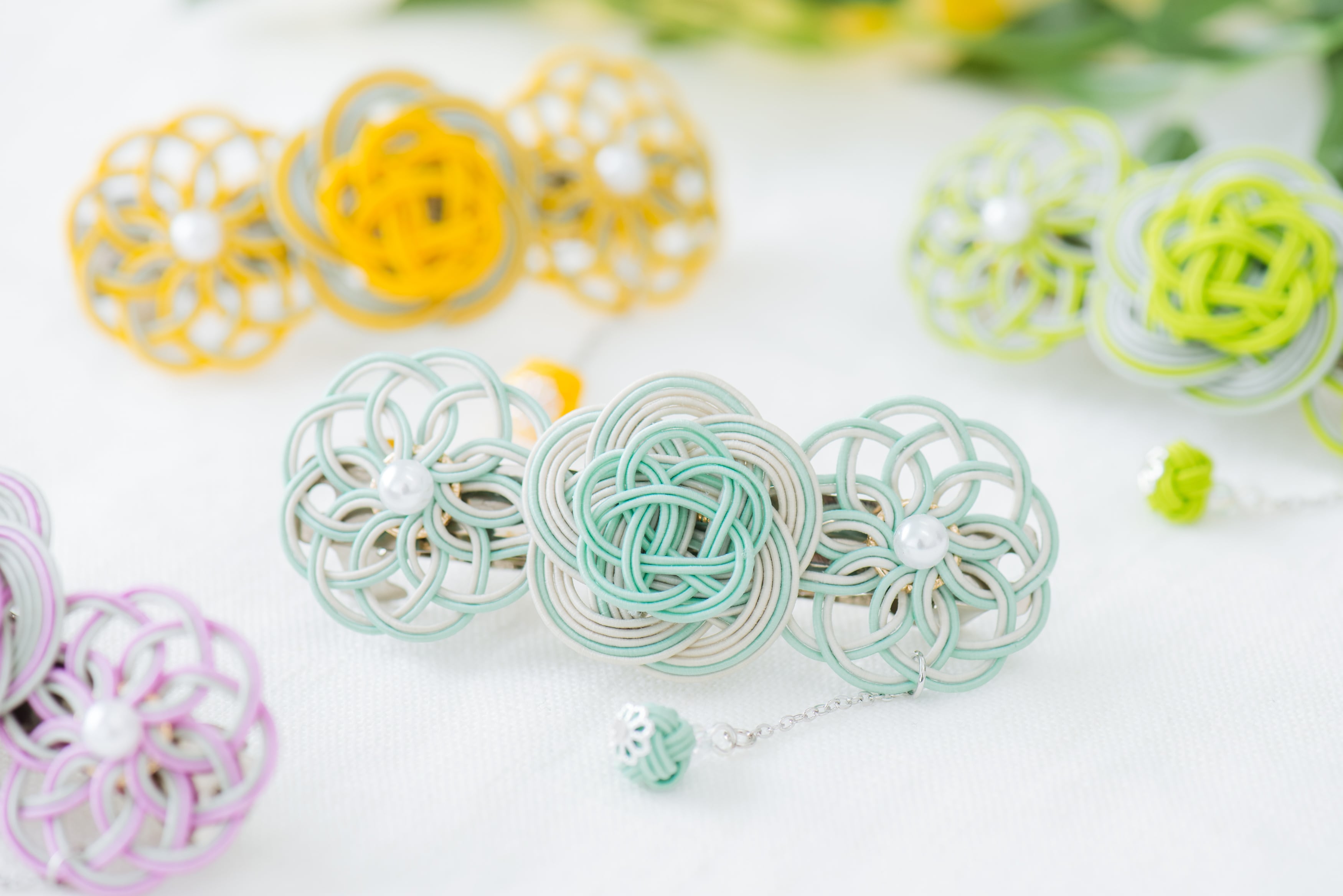 色は、石竹・鶯・山吹・水浅葱・藤の全5色。軽くて、意外と丈夫な水引のアクセサリーは、身に着けても負担にならず長く楽しめるのも特徴です。
