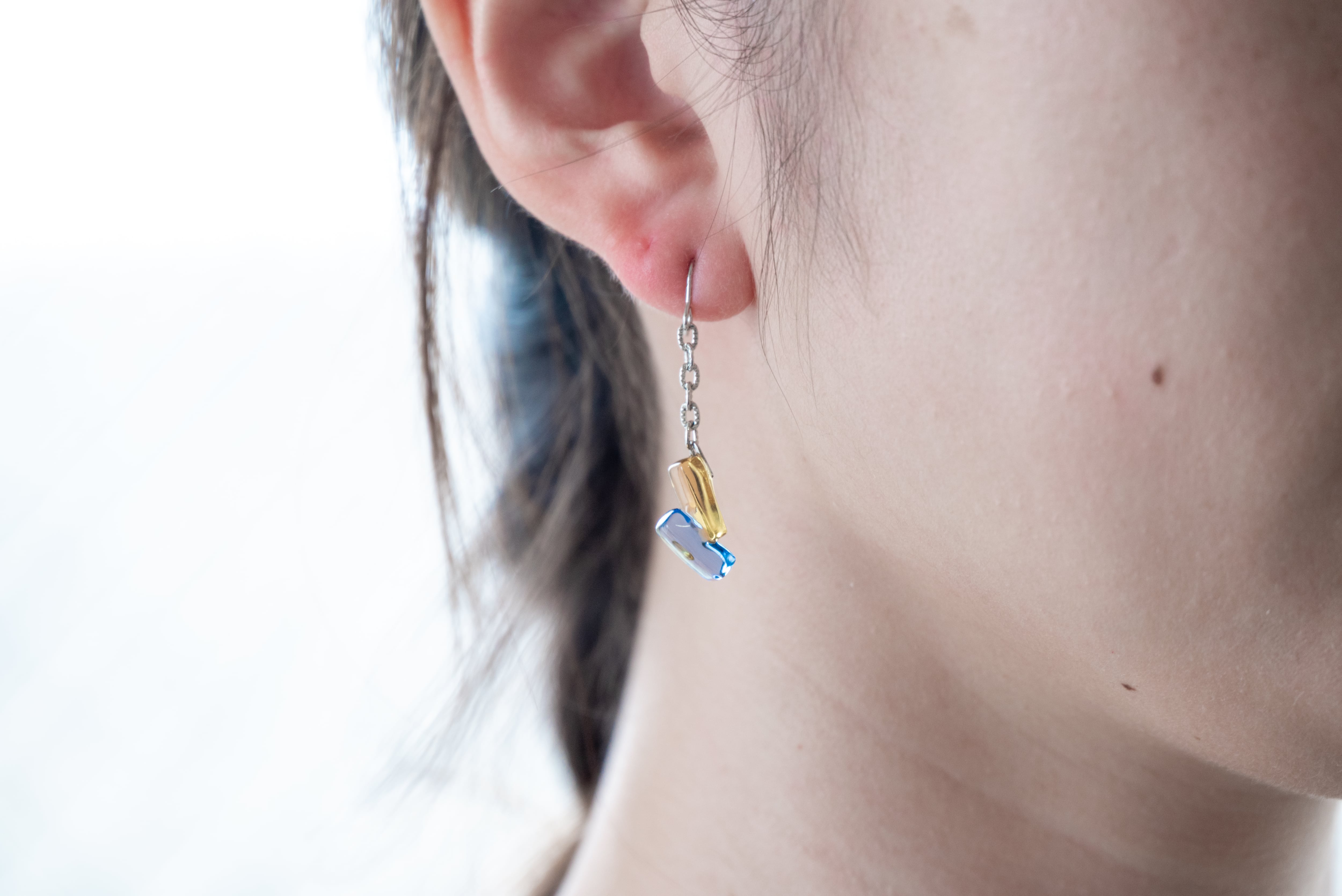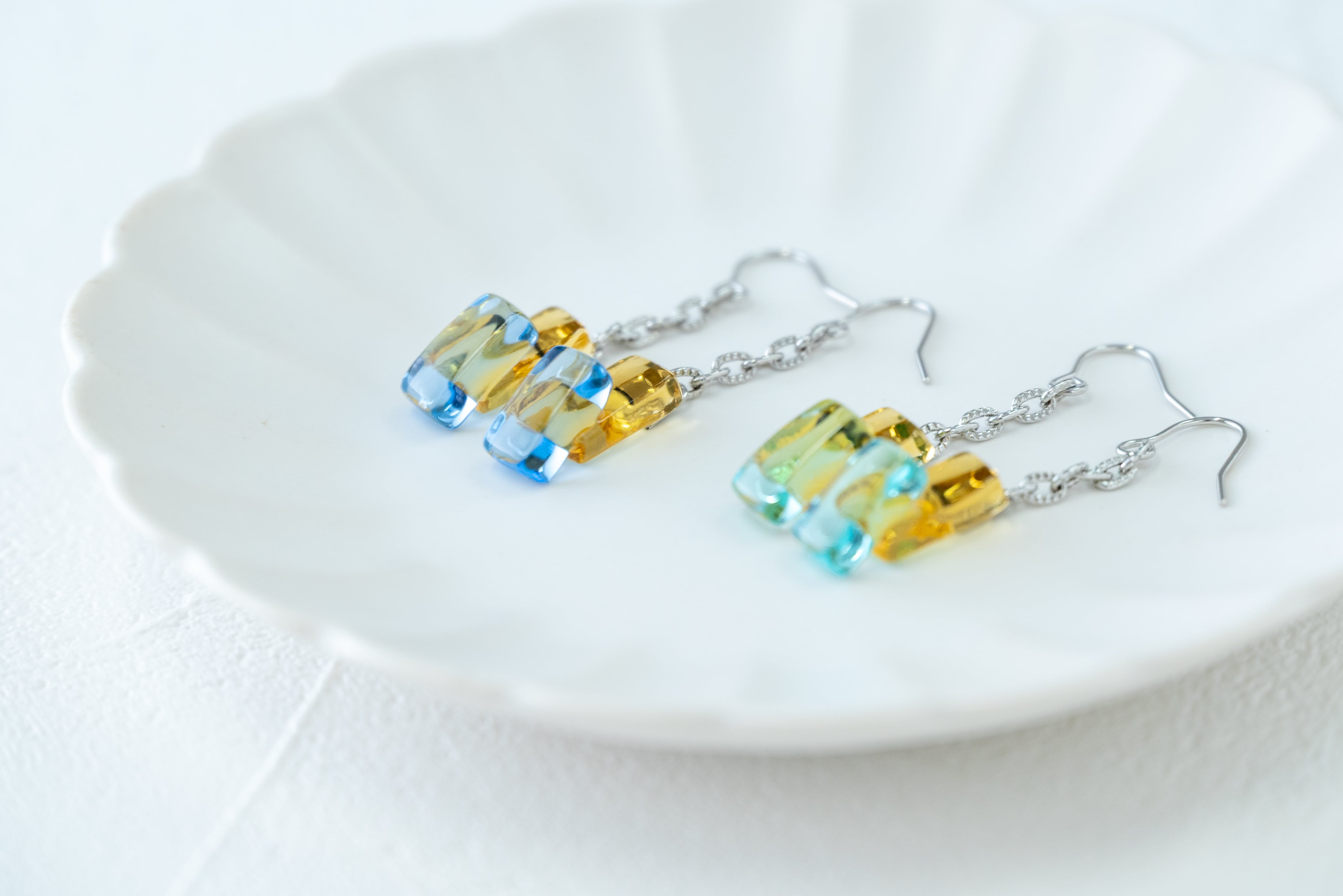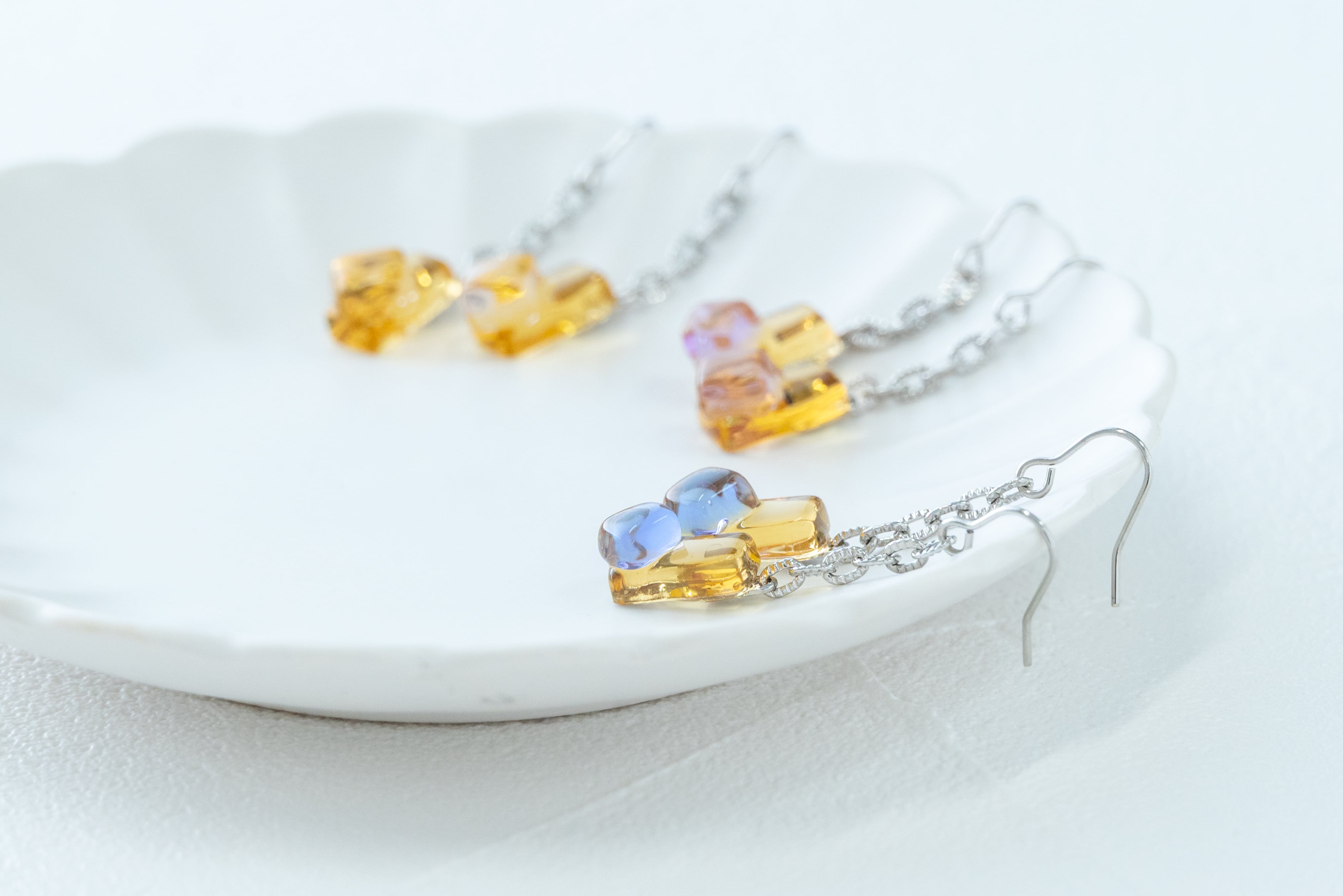 静岡各地の四季折々の風景に着想を得た作品。重ねたガラスが角度によって異なる色彩を放ち、様々な表情を見せます。光線によって色が変わる『変色ガラス』は、太陽や蛍光灯の光を受け、グリーンはルバーブピンクに、ラベンダーはブルーに。耳元で光を受けて煌めきながら揺れる、ガラスならではの美しさを感じるアクセサリーです。